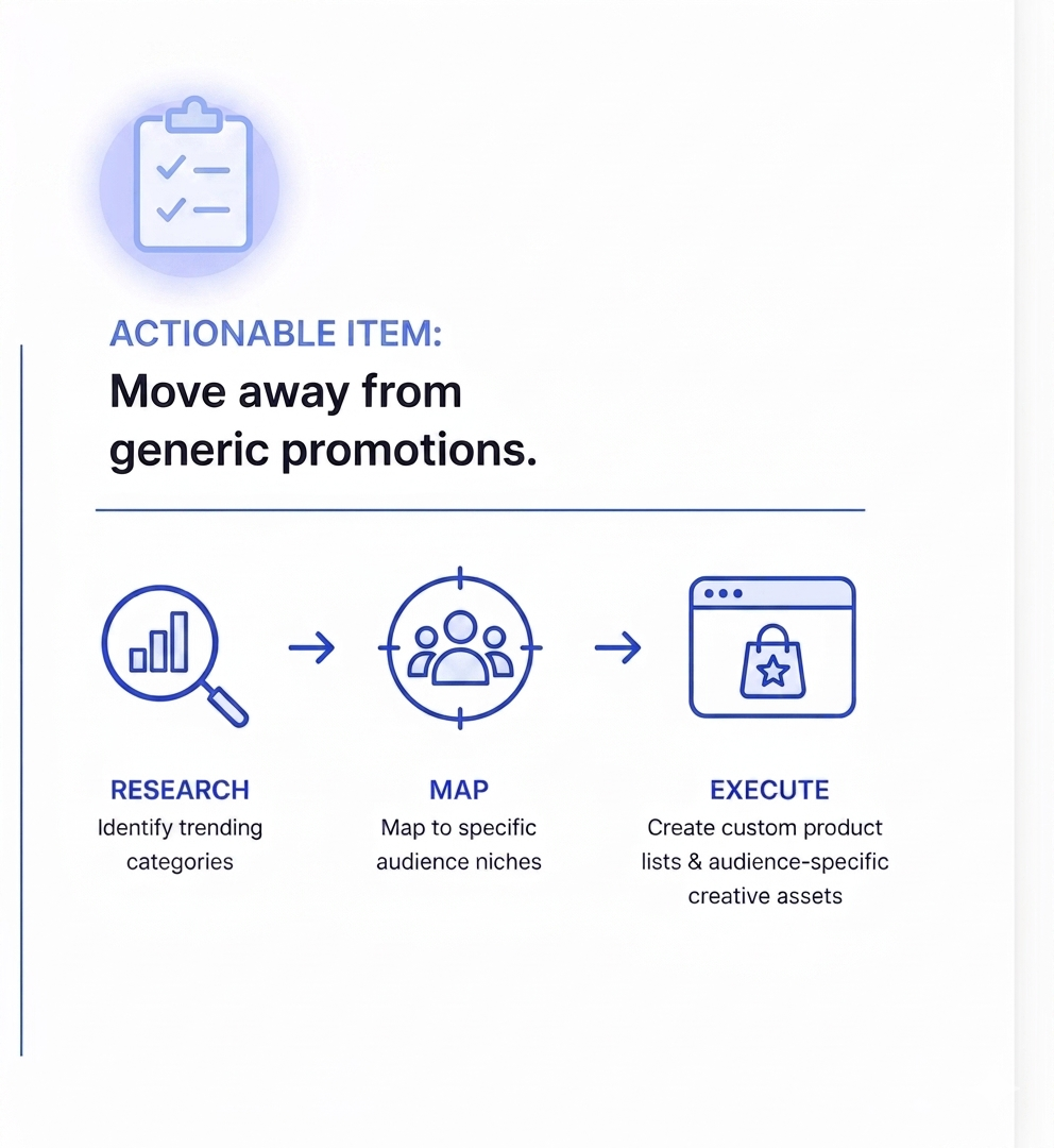 - Actionable Item: Move away from generic promotions. Invest in deep market research to identify trending categories and map them to specific audience niches through both custom-built product lists and audience-specific creative assets.
